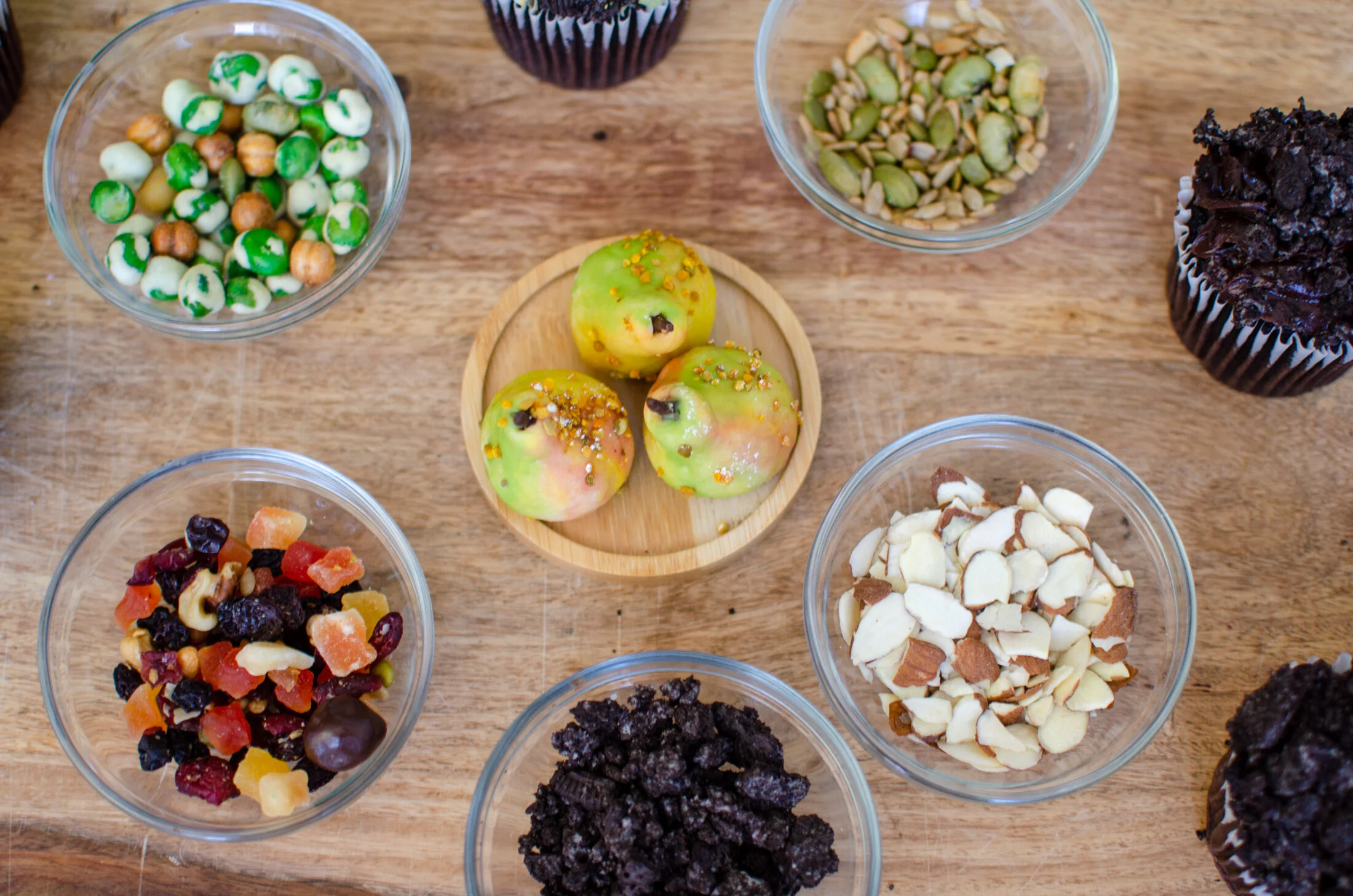 2. Working one at a time, sprinkle the cupcake with Oreo cookie dirt and other toppings - littles are great at sprinkling! We thought wasabi peas and dried chickpeas look like tiny gourds and pumpkins nestled in the dirt. Green pepitas and pieces of pistachios also look like grass. Has your little visited a pumpkin patch yet? Ask them what they think of these topping ideas!